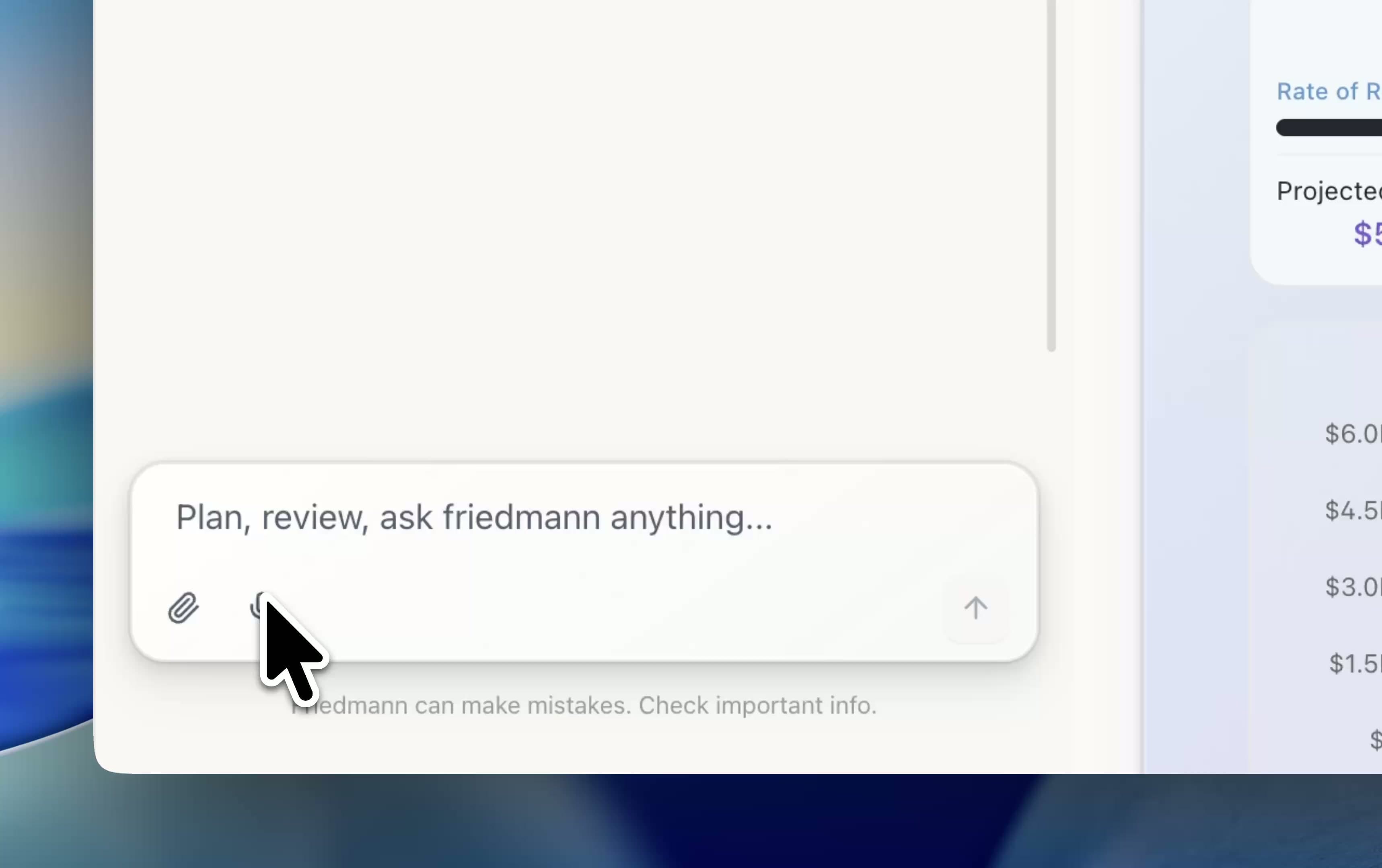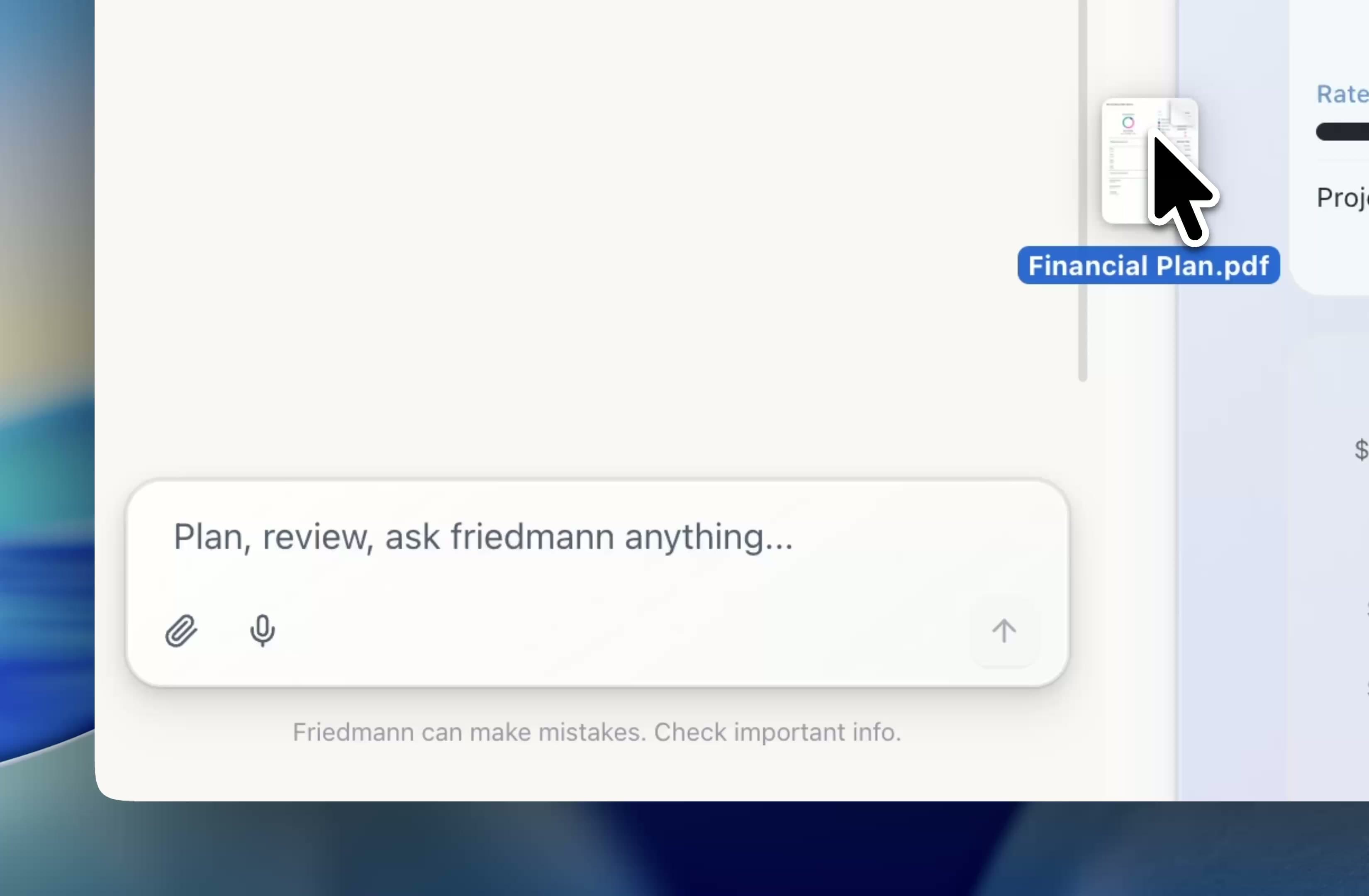 Upload financial plans, investments statements, insurance policies, and more, and let Friedmann analyze them for you. No more manually entering data into spreadsheets or planning software.